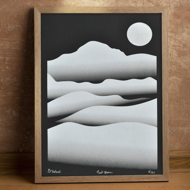 Sérigraphie 2 couleurs du Mont Blanc format A3 sur papier noir Paint On.